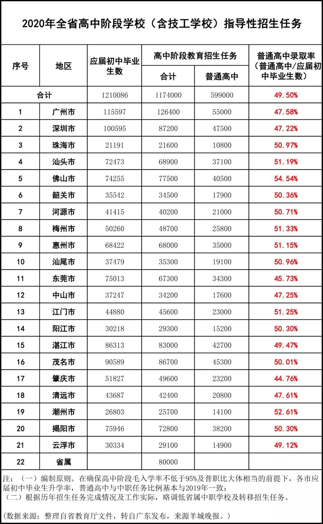 最近,广东省教育厅、广东省人力资源和社会保障厅宣布下达广东2020年高中阶段学校指导性招生任务和转移招生任务,其中,佛山今年初中应届毕业生为74255人,普通高中招生人数为40500人,普通高中录取率为54.54%,但也意味着,今年的佛山中考约有45.45%的初中应届毕业生上不了普通高中(即有33755人将上不了普通高中),分流至中职和技工学校去。而佛山市录取率却已排在全省21个地级市之首。