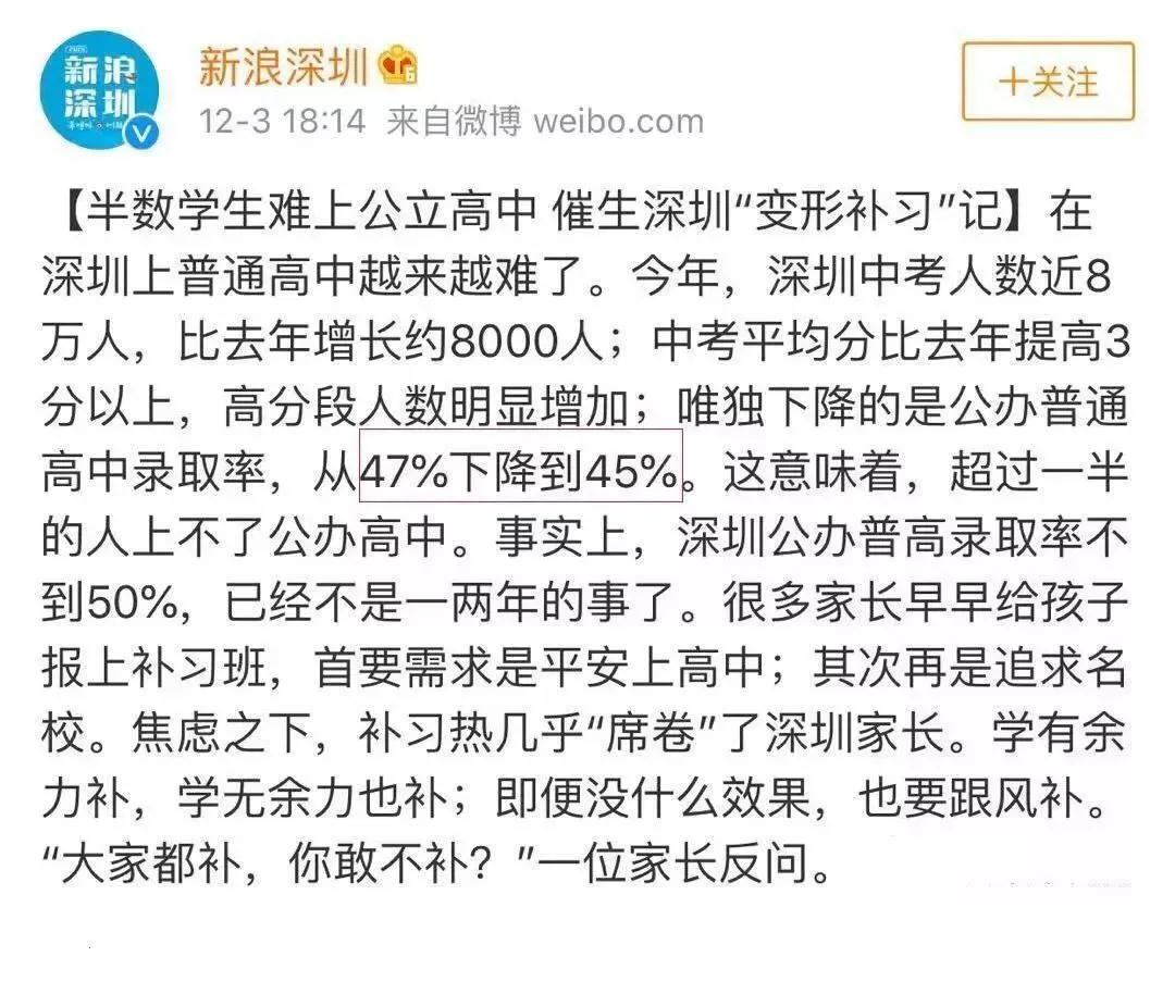 再来看看深圳高中录取率, 目前深圳的公办普通高中录取率,已经从47%下降到45%!