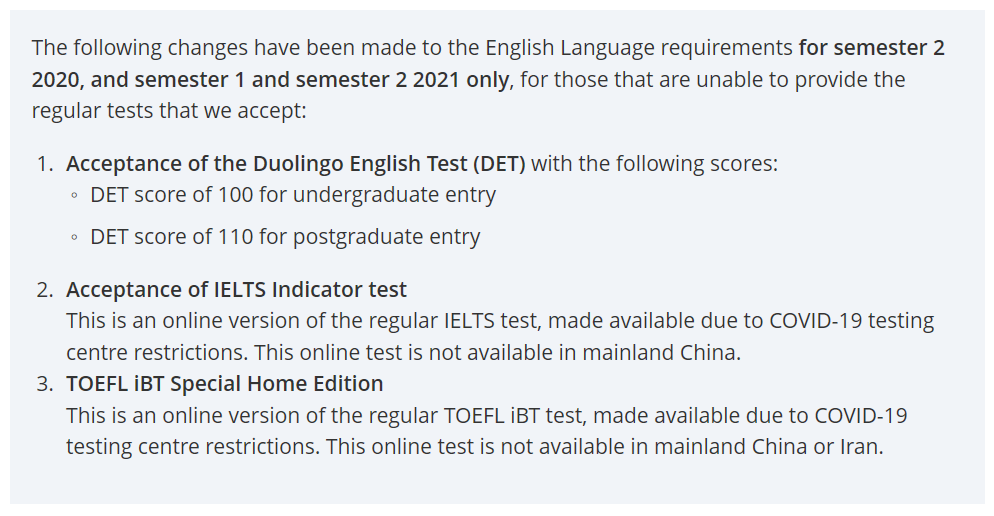 鉴于目前全球多地因受疫情影响而无法组织雅思、托福、PTE等常规语言考试,奥塔哥大学目前接受申请者使用以下多种语言能力测试来进行申请: