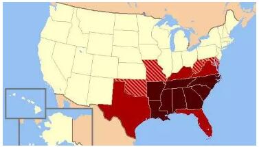 上图中,深红色的州表示在现代标准中都会被划为南部的州,而红色则是大多会被包含在内的州。加上斜线条纹的州则是有时候或偶尔会被视为南部的州。