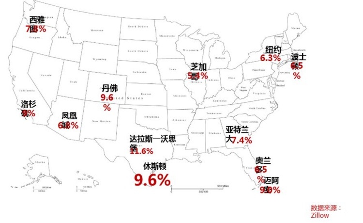 上图显示的是美国房价的增长,南部地区的房价,随着美国经济重心的迁徙,在逐步增高,尤其是德州地区(达拉斯11.6%,休斯顿9.6%),从上图可以看出,其房价的增长是最为迅猛的。佛罗里达州、佐治亚州紧随其后。这说明美国南部地区的经济整体上是一个欣欣向荣的状态,这对于未来留学生就业选择来说,是一个很好的参考。