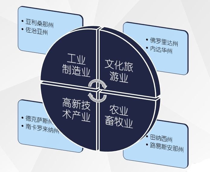 美国南部的经济发展也和本州的发展定位有关。德州引入了很多高新产业(如NASA、波音),佛州在大力发展旅游业的同时,也开始引入高科技产业,拿迈阿密来说,它致力于打造成一个科技城,于是从硅谷引来了不少企业,还曾一度出现用工荒。当地的大学如迈阿密大学也在培养高科技人才方面下足了功夫。