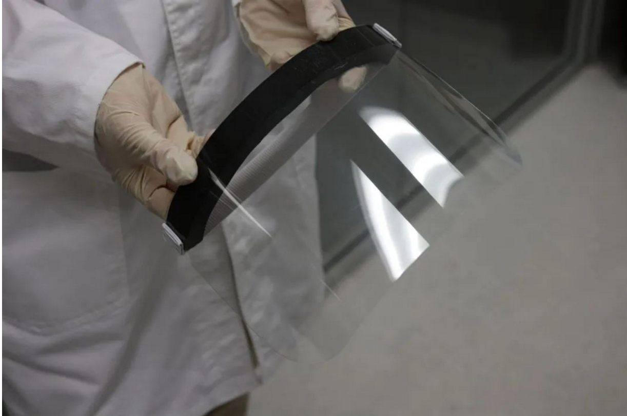 正是由于我们所做的这些努力,至关重要的防护面罩已经被送至最需要的地方。这是物理学家、工程师、设计师和医护工作者共同努力的成果。防护面罩由一块 PET 塑料制成,用一条弹性发带固定住。