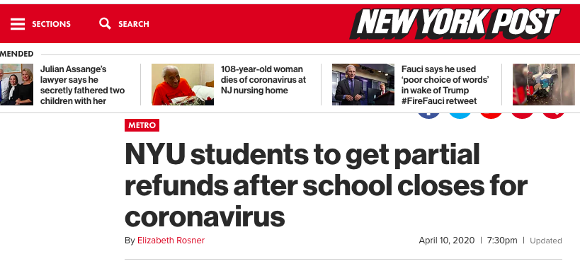 根据New York Post 4月10日报道,纽约大学也宣布将退还部分款项给学生,退款不包括任何学费,只有与课程设备和服务相关的费用会全部或部分退还。