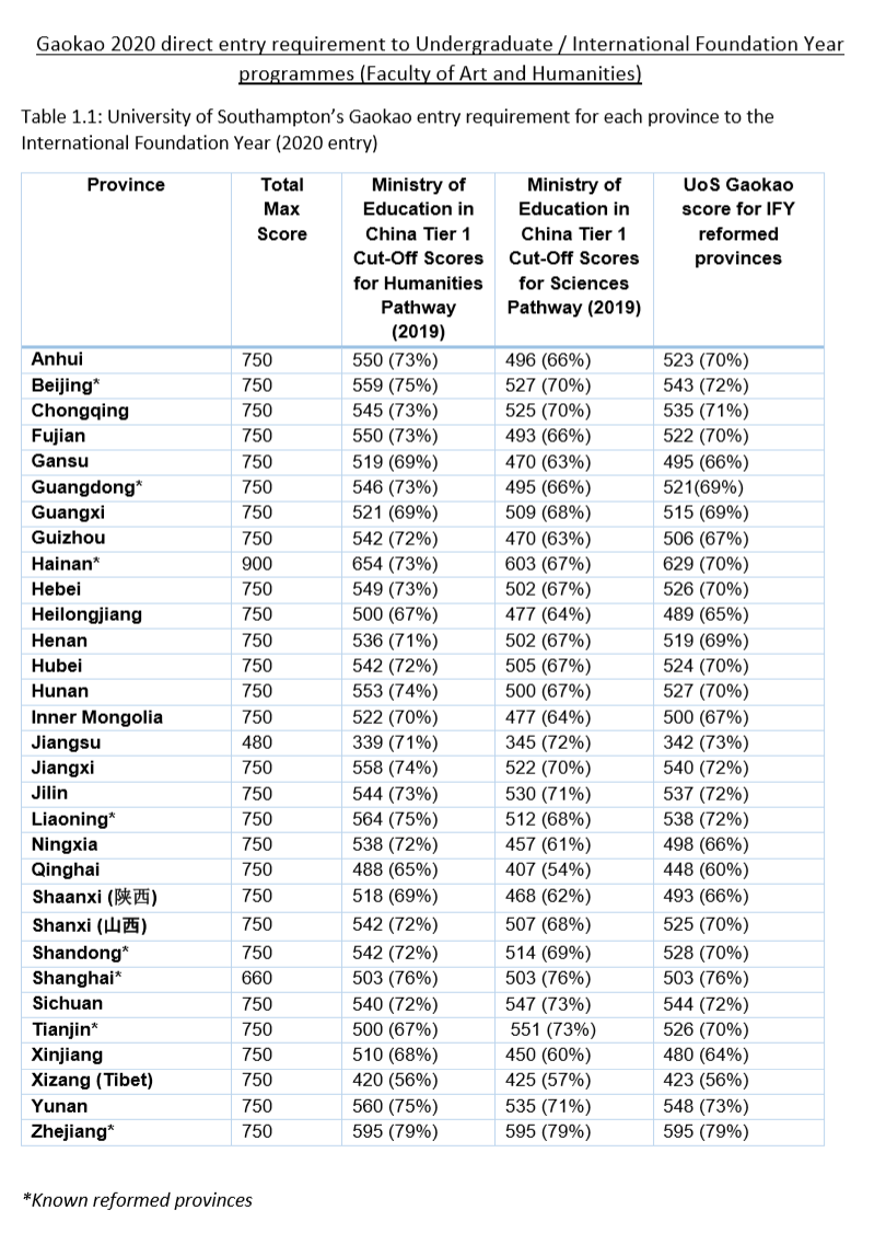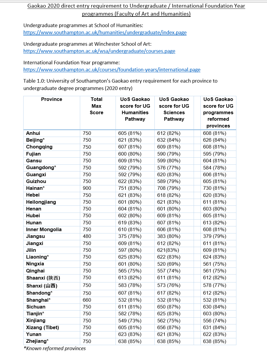 南安普顿大学针对2020年入读,接受高考成绩申请,只限Faculty of Arts & Humanities。各省市分数录取要求