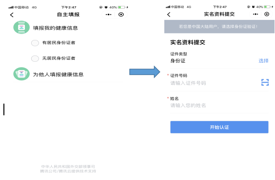 如有身份证,须按“有居民身份证者”填报并进行实名认证。如果没有身份证,可选择“无居民身份证者”入口,使用护照(或旅行证)进行填报,并需按程序提示上传相关照片以便进行实名认证。