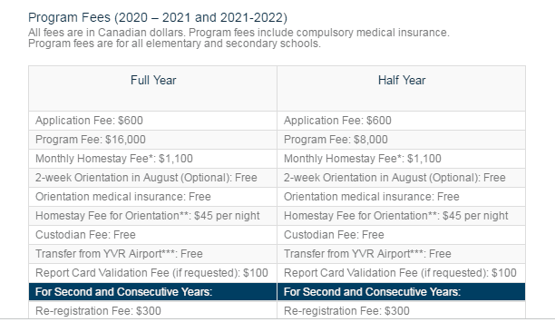 二、西温哥华教育局2021-2022学年的学费将保持和2020-2021学年一样: