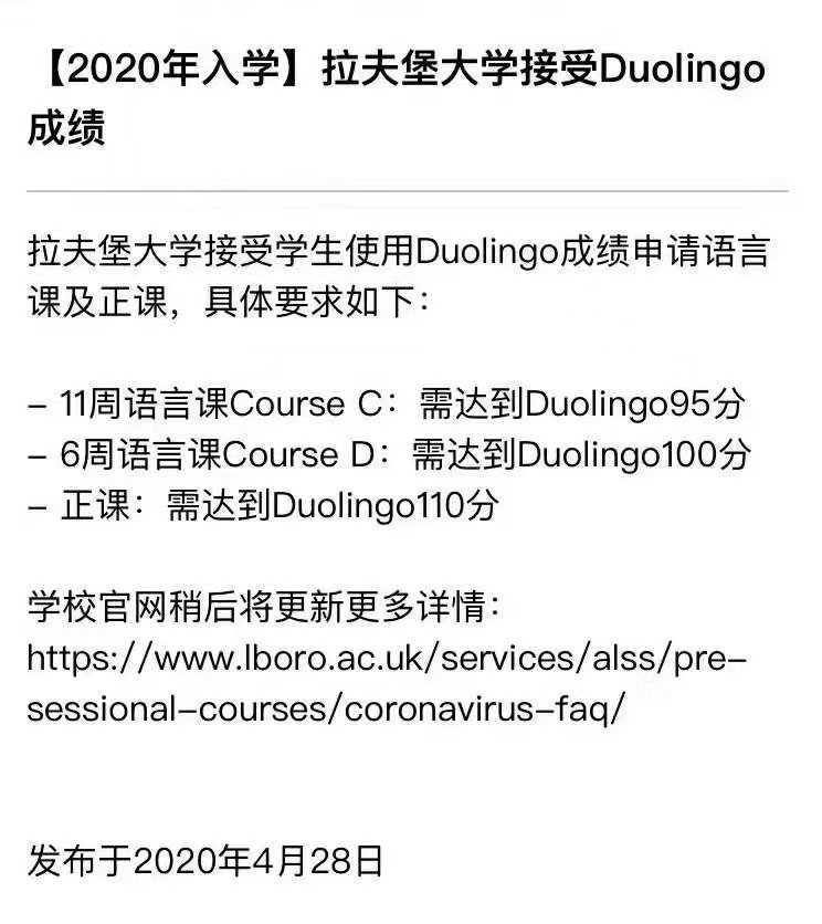 2020年入学,拉夫堡正式接受Duolingo测试成绩入读语言课及正课。具体见下图: