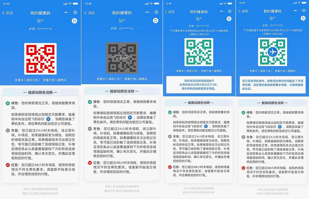 外交部再次提醒,在当前新冠肺炎疫情全球蔓延的情况下,海外中国公民要充分评估国际旅行可能带来的交叉感染风险,非必要不旅行。近期确需从有关国家回国的海外中国公民应严格按照中国政府有关公告要求,通过健康码国际版小程序如实填报个人信息。请大家密切留意每次填报后的健康码状态(包括相应颜色、有效连续填报起始时间及是否出现飞机标识等),如需重新规划行程,请尽快联系航空公司办理退票和改签手续。
