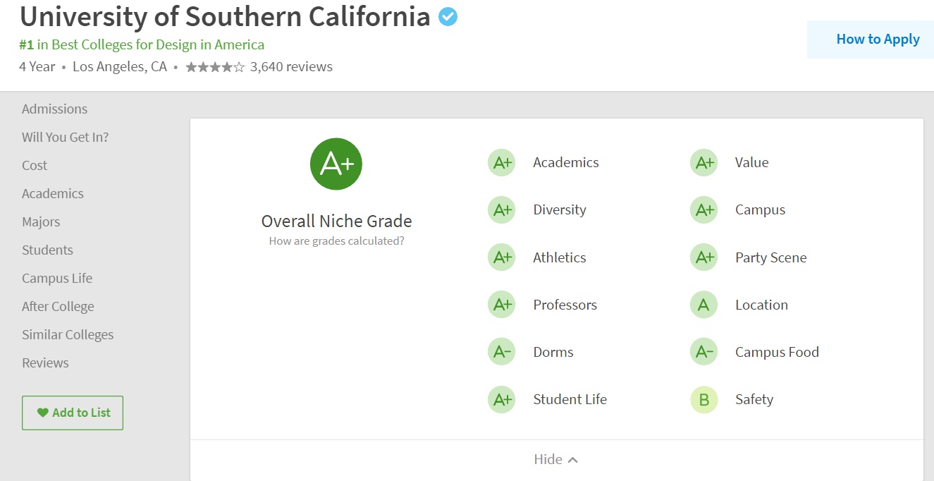 号称美国学校的“大众点评”的Niche,可谓最懂学生心声的排名机构了。不仅排名数据大量取自各学校的在读学生的亲身体验,而且将这些数据汇总,制作出与入学后的学习和生活息息相关的排名榜单,不仅有本科专业major的排名,最佳学术学校,最强教授学校等学术方面的排名,还有最佳美食学校,最佳住宿学校,生活质量最高学校,party风最强学校等等非常接地气的排名。