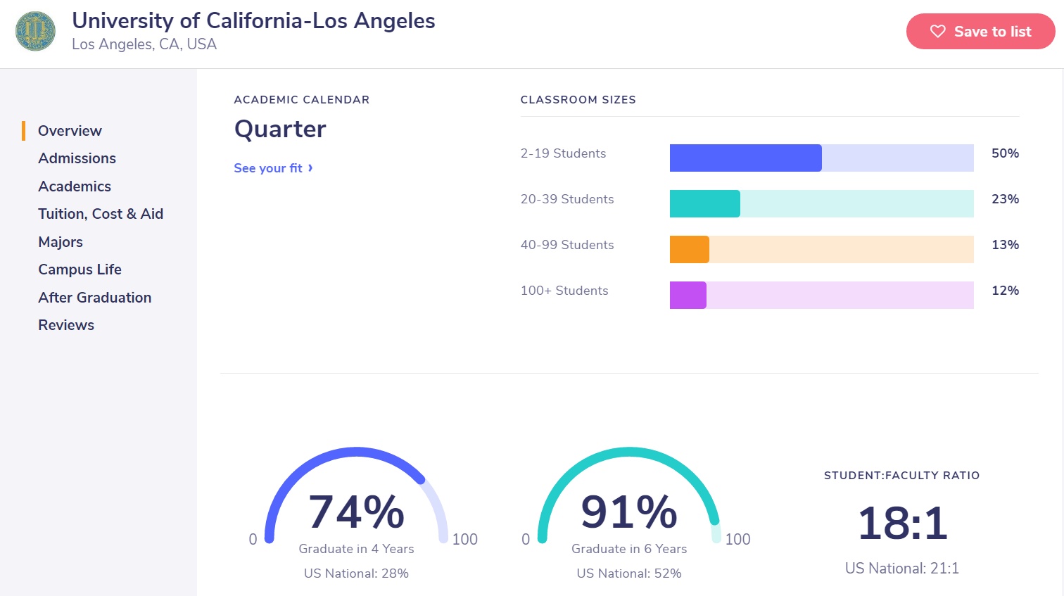 Cappex提供申请竞争激烈程度,标化考试区间,校园位置(郊区/小城镇/大城市),学生规模等非常实用的筛选工具,可以帮助自己迅速定位到某些特征的学校。对于标化要求,学制及详细的班级规模分布,专业及研究生项目完整清单等,均有清晰的展示。