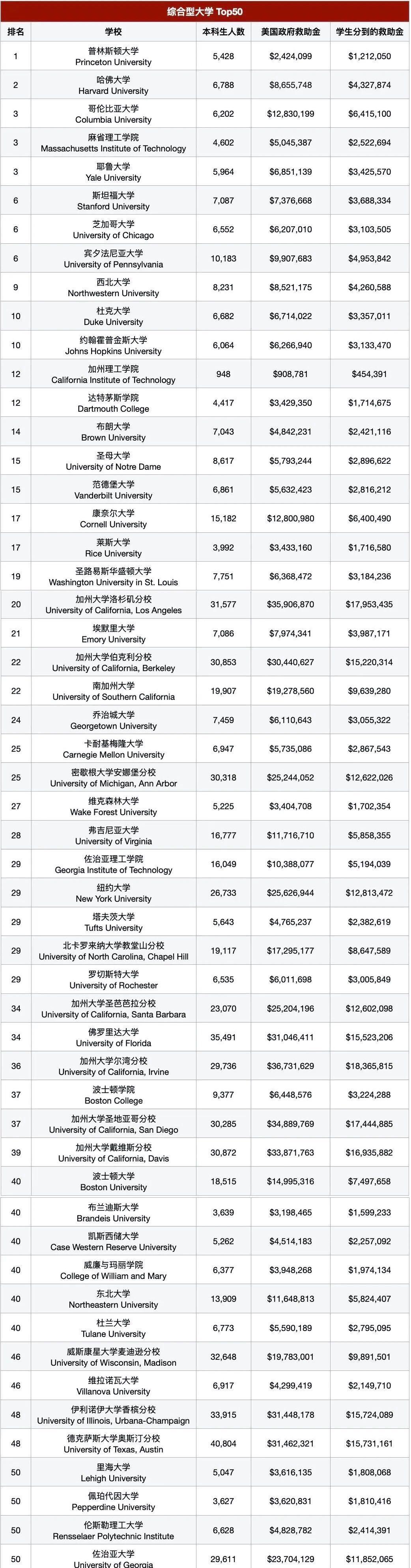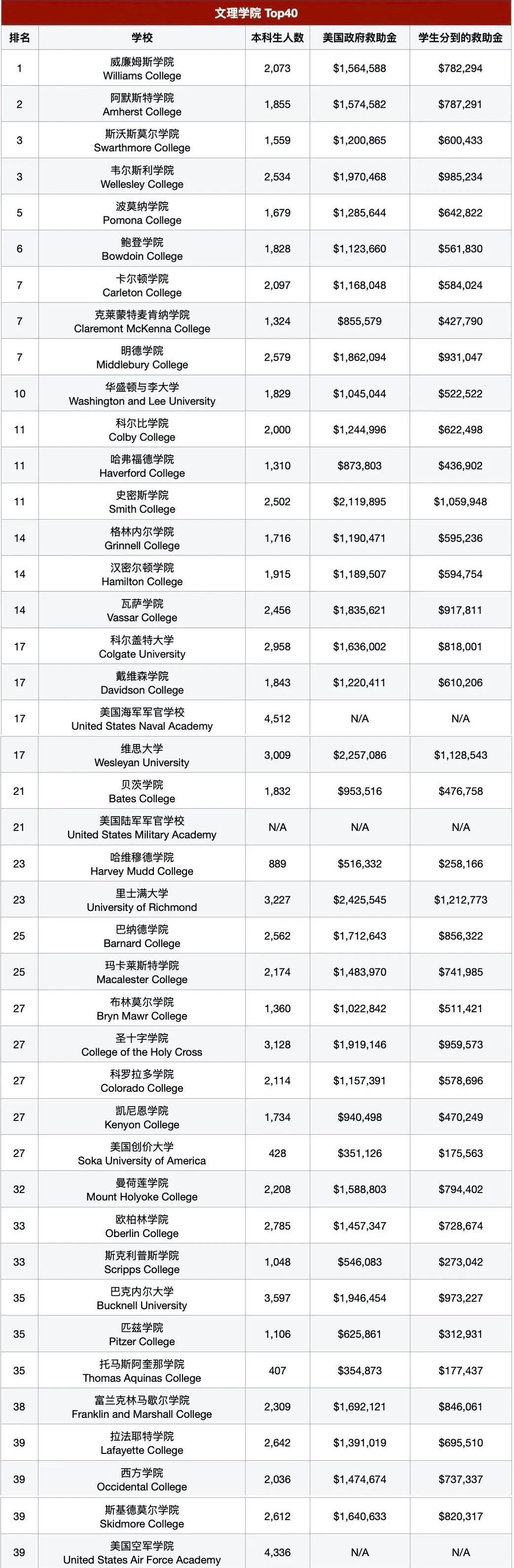 在这里,我们放了一张表格供大家参考,上面罗列了U.S.News排名前50名的大U和前40名的LAC可申请的救助金预算。这张表显示了每所学校最多能领到的金额,不代表他们实际已经到账的钱。