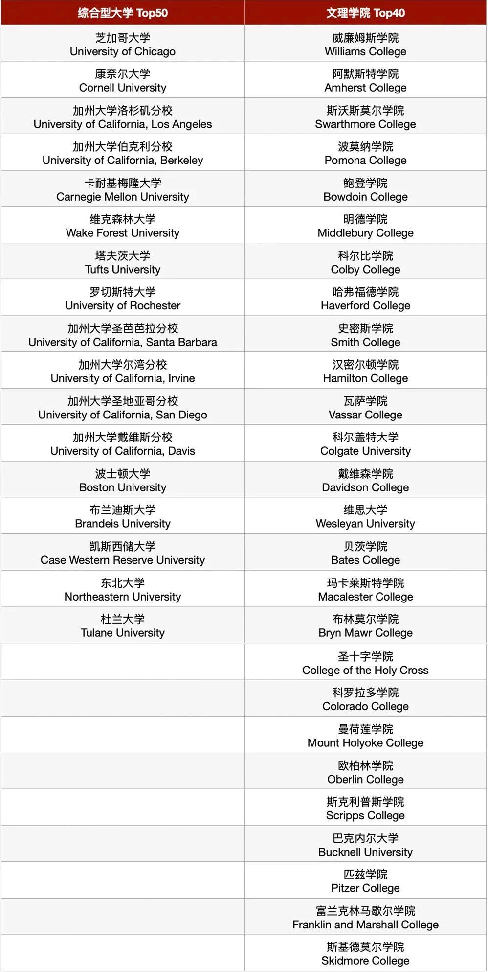 我们给大家做了一张表,罗列了U.S.News排名前50名的大U和前40名的LAC中,目前已经宣布test-optional的学校。