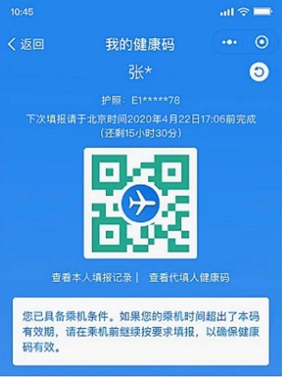 请大家密切留意每次填报后的健康码状态(包括相应颜色、有效连续填报起始时间及是否出现飞机标识等),如需重新规划行程,请尽快联系航空公司办理退票和改签手续。