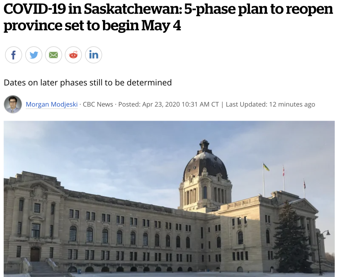 近日,加拿大多个省份出现了重启的意向,其中萨斯喀彻温省最早,宣布5月4日重启,安省省长福特也表示会在最近几天公布重启框架计划。