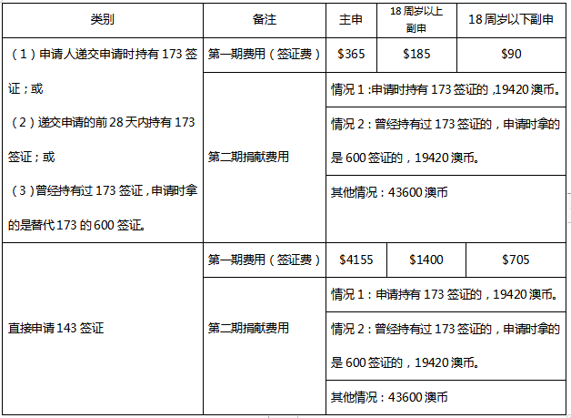 注1:如果之前没申请过173的,直接申请143的,那么,在递交143申请时,先支付基本申请费4155澳币(如果父母都申请,就是4155+1400=5555澳币),接下来等移民局来信通知你要支付第二期款,就是捐资费用,每人43600澳币,一次性支付后,得到143签证。