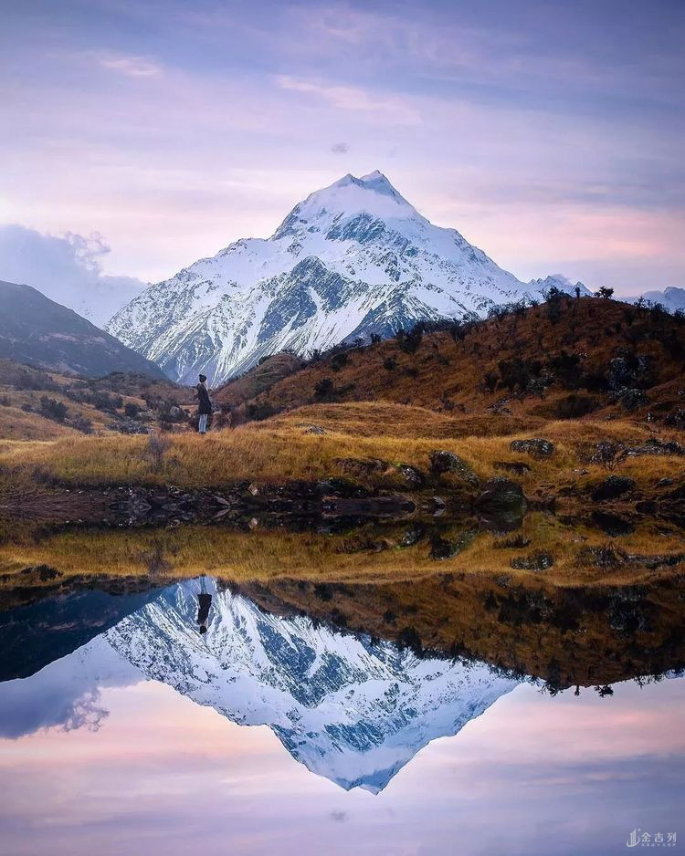 有人用这首诗来形容这里的景色,确实库克山的壮丽美丽征服了每一位前来观光的游客。云彩被横串库克山脉的风吹得不断翻滚,逐渐扩散开来,库克山的雪峰慢慢展现真容,惊艳无比。天亮起来了,一切都恢复了色彩,雪白的山峰、蓝色的天空、灰色的岩石、奶白色的溪水,交织成一副美妙的画面