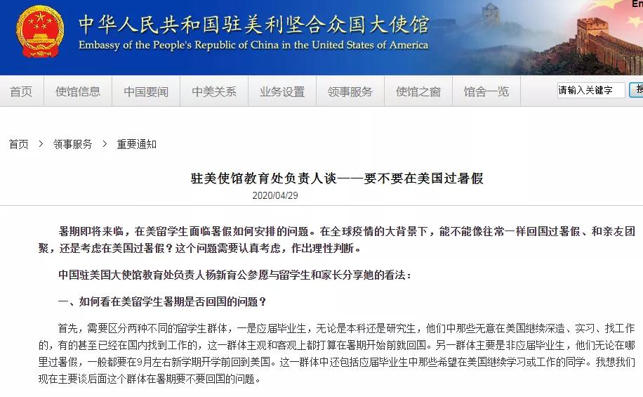 暑期住宿问题是同学们非常关心的问题之一。 通常情况下,美国大部分高校的学生宿舍在暑期是关闭的,但鉴于疫情的特殊情况,美国高校对国际学生暑期住宿作了新的安排。 据我们向杜克大学、弗吉尼亚理工大学、亚利桑那州立大学等高校初步了解,如果国际学生向校方提出申请,要求暑期继续住宿,学校会考虑作出安排。 有需求的同学可以尽早向学校国际学生办公室进行咨询。 我们也建议同学们作两手准备,关注校外的租住房源情况。 为了帮助同学们解决实际困难,驻美使馆正在联系一些旅行社,请他们协助寻找合适的房源并向同学们提供有关信息。 我本人作为一名学生家长,还想提醒选择在美国过暑假的同学们,几个月的暑期是可以充分利用好并有所收获的。 美国暑期时间长,疫情当前又要求大家“宅”在家中,同学们只要提前做好规划,就能过一个有收获、有意义、值得回忆的暑假。 据我们了解,美国大部分高校都会以网课形式提供暑期课程,这些课程都有学分。 除了选择自己院校的暑期课程,也可以选择其他院校或机构可兑换学分的课程。 此外,美国现在有大量的优质教育资源免费向社会开放。 网络上的娱乐资源则更多,相信同学们比我更在行。 总之,暑期能够做的事情还是非常丰富的。