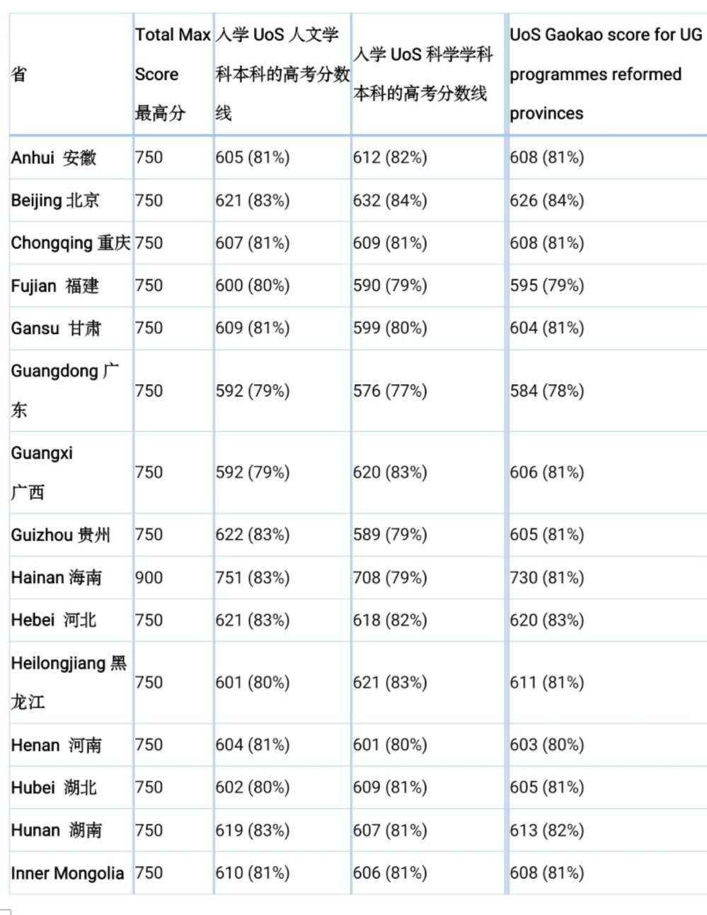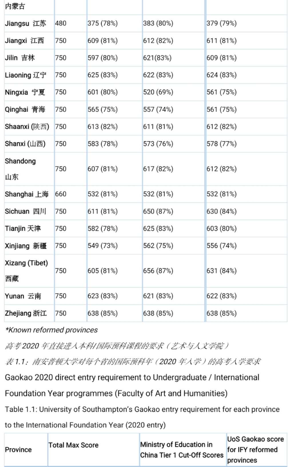 南安普敦大学的高考入学条件(各省)(2020年入学)