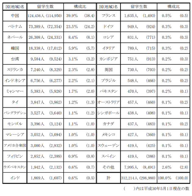 从今年公布的数据来看,截止到2019年5月1日,在日外国留学生总人数为: 312,214人 ,比前一年增加了13,234人(4.4%)。 此前,日本提出“到2020年,接受30万外国留学生”的计划, 从现在的数据来看,日本政府也实现了这一目标。