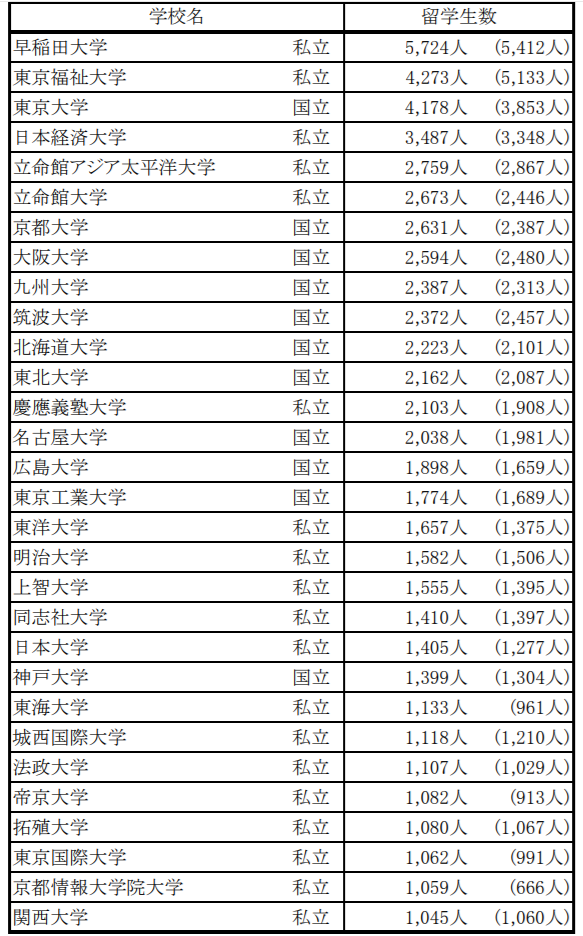这份调查每年都会发布一次,统计对象包括大学(含大学院)、短期大学、高等专门学校,专修学校、为进入日本大学而设置的教育设施以及日语教育机关等的在籍外国人留学生。