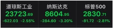 然而, 就在特朗普总统威胁或通过加征关税等措施对中国展开报复后,美国股市大幅下跌。 美国三大股指当地时间星期五(5月1日)集体收跌,跌幅均超过2%。纳斯达克综合指数跌284.60点,收于8604.95点,跌超3%,道指下跌622.03点,收于23723.69点,跌幅2.55%,标普500指数则下跌81.72点,收于2830.71点,跌幅2.81%。
