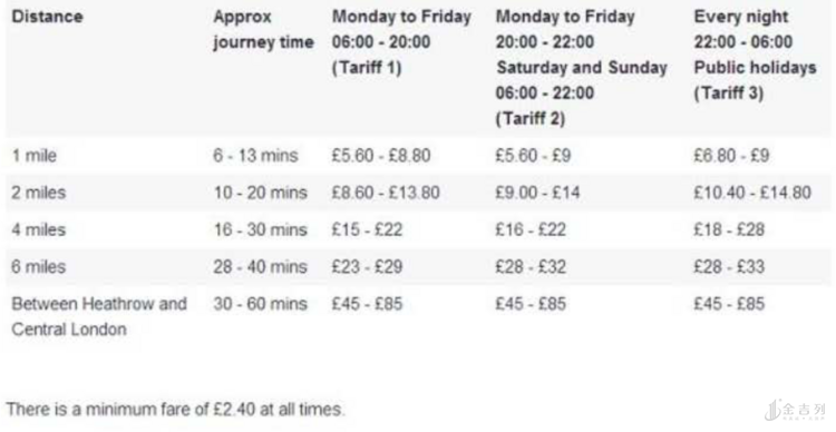 一个周末的中小型轿车租费在£70-80之间;出租车收费请看下图,三个字形容就是: 贵贵贵!嗯……起步价最低有£2.40,15分钟车程至少10镑吧~