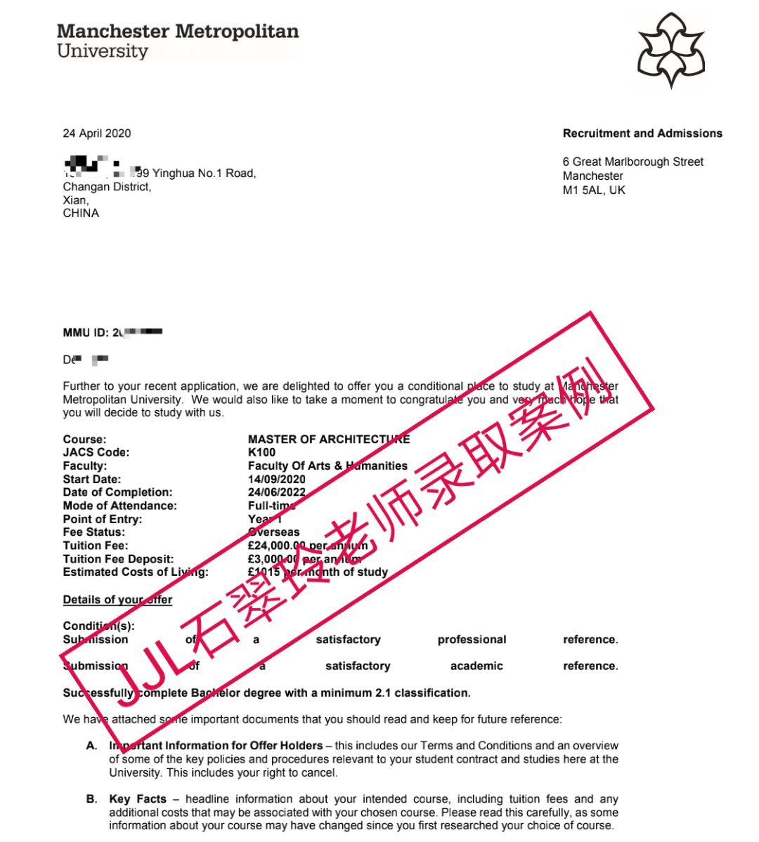 学生是大三上确定继续在英国读建筑学,但是学生父母不太支持她继续读建筑,因为觉得这个专业将来工作就是做设计,太辛苦,不想让孩子太累;因为学生读的是西交利物浦2+2项目,所以去英国前学生就确定了在金吉列办理自己的硕士申请,虽然父母不想让孩子太辛苦,但是学生自己在利物浦大学读大三期间,越来越爱上这个专业,大三下就确定继续申请建筑学硕士,目标是两年制且有RIBA2认证的学校,我们就一起确定下来了要最终申请的学校,学生就开始准备自己的作品集;由于学生对于自己的作品集要求很高,再加上2+2项目大三大四课程都很密,学生一方面准备作品,一方面完成本科学业,最终在大四下学期完成了最终自己满意的作品;在次期间我们根据学生的教育背景,突出了学生在英读书期间的很多经历及作品小项目,在申请材料突出学生对于专业的很多见解,申请递交一个多月后,就拿到了曼大和MMU的联合培养的录取。