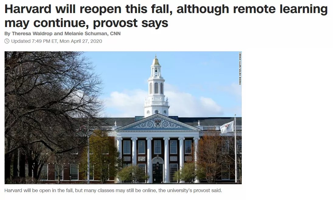 无独有偶,哈佛大学教务长在校报中公开宣布:哈佛大学2020年秋季学期将正常开学。如果疫情稳定,将恢复面对面授课;如果疫情还未稳定,部分或全部课程可能会继续在网上进行。