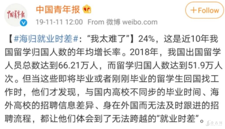 再加上国内应届生的竞争:据教育部官方估计,2020年高校毕业生将达到874万,同比增长40万。留学生们的竞争前所未有的激烈。