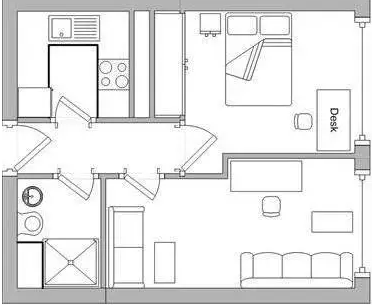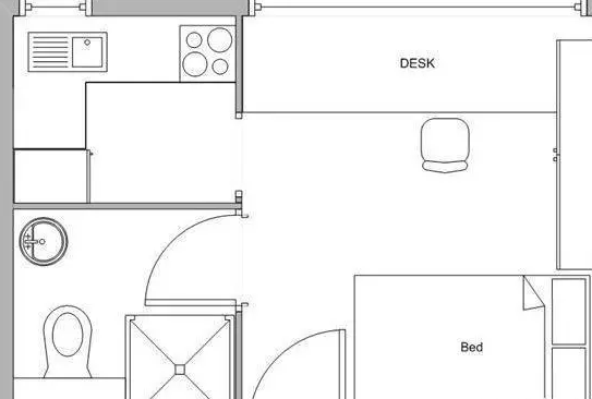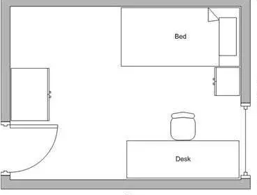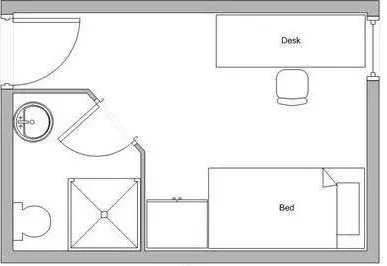 Basic /stanar Room Basic Room是指基本单人间,房间内只有最基本的家具和设施,浴室卫生间和厨房都是共用的。在由三个以下的Basic /stanar Room组成的Flat里配备一个卫生间,四个到七个Room的Flat配备两个卫生间。大部分学生公寓的配备会比此标准更加严格。Basic /stanar Room是这三种房型中价格最低的一个,所以是最经济实惠的选择。 下图是学生公寓的 Basic Room户型: