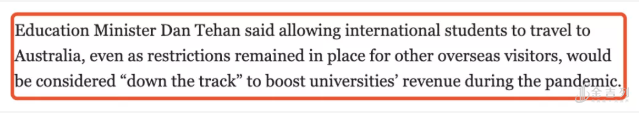 这一次,澳洲教育部长tehan直接和澳媒说到: “我们正式考虑, 让 留 学生能够不受禁令影响, 提前回到澳洲上课”