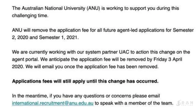 4月3日起递交的对2020第二学期和2021第一学期的申请将减免申请费。 其他澳洲大学会否进一步采取降低录取要求的方式, 目前还有待确定。 但是很可能就是个趋势。