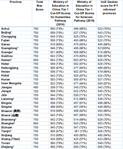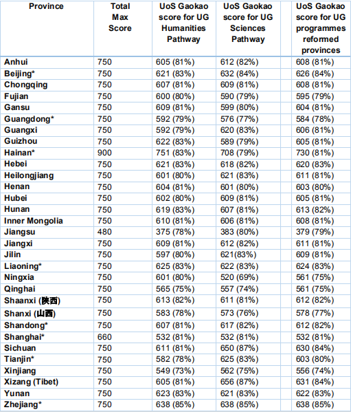 对于具体的分数要求,南安普顿大学也根据中国各省的招生政策制定了相应的分数要求,具体如下: