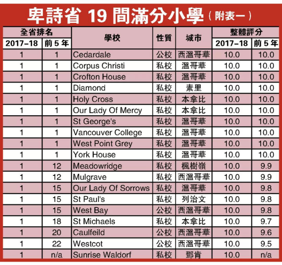 菲沙研究所为加拿大智囊组织,自2003年开始,每年都为全省小学排名。最新公布的排行榜,是菲沙研究所依据各校2017/2018年度FSA成绩的10项指标,对全省955所公立及私立小学进行排名。今年获得满分的小学共有19所,较去年的21所有所减少。不过,其中公立小学就由两所增加至4所,除Cearale与West Bay两所继续上榜外,新增了Caulfeil及Westcot两所