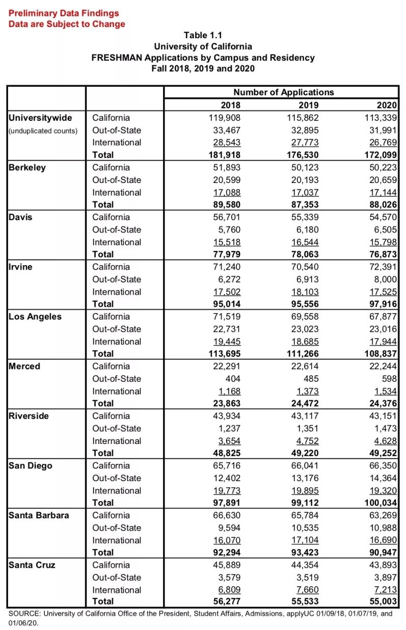 近日,加州大学公布了2020秋季入学申请的数据,这个申请季共收到215,162份入学申请,比2019年秋季(217,650份)减少了1.1%,新生申请减少了4,431,下降2.5%。这是加州大学自2019秋季申请来的申请人数第二年连降。但转学生申请人数则在上升中。这是不是意味着我们的申请成功率会上升呢?