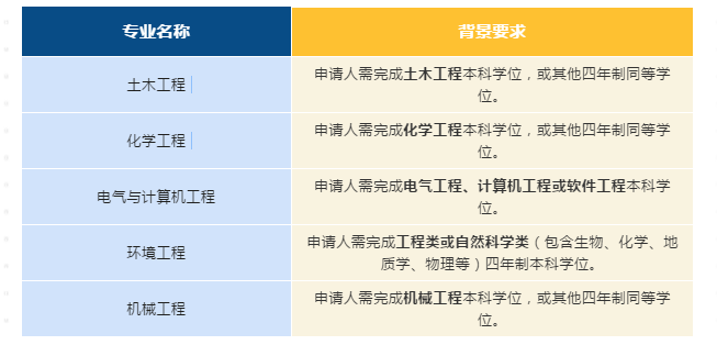 若学生的本科学习背景不满足申请要求,则需要先修读工程研究生委员会(Engineering Grauate Stuies Committee)推荐的工程类过渡课程,并满足英语语言要求。