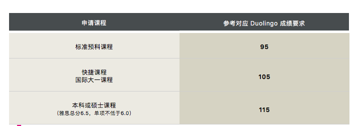 Duolingo English Test的最高分是160分,麦考瑞大学接受以下成绩,并对未达到标准的申请者配套语言教学。