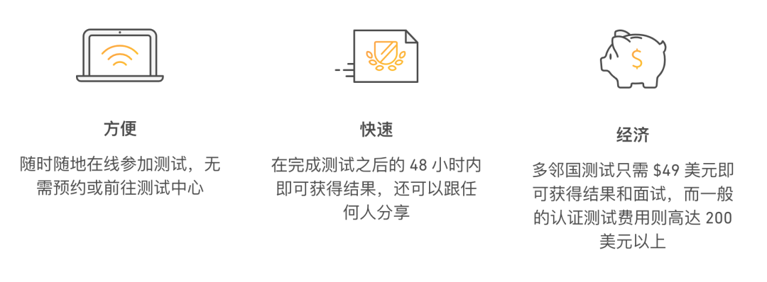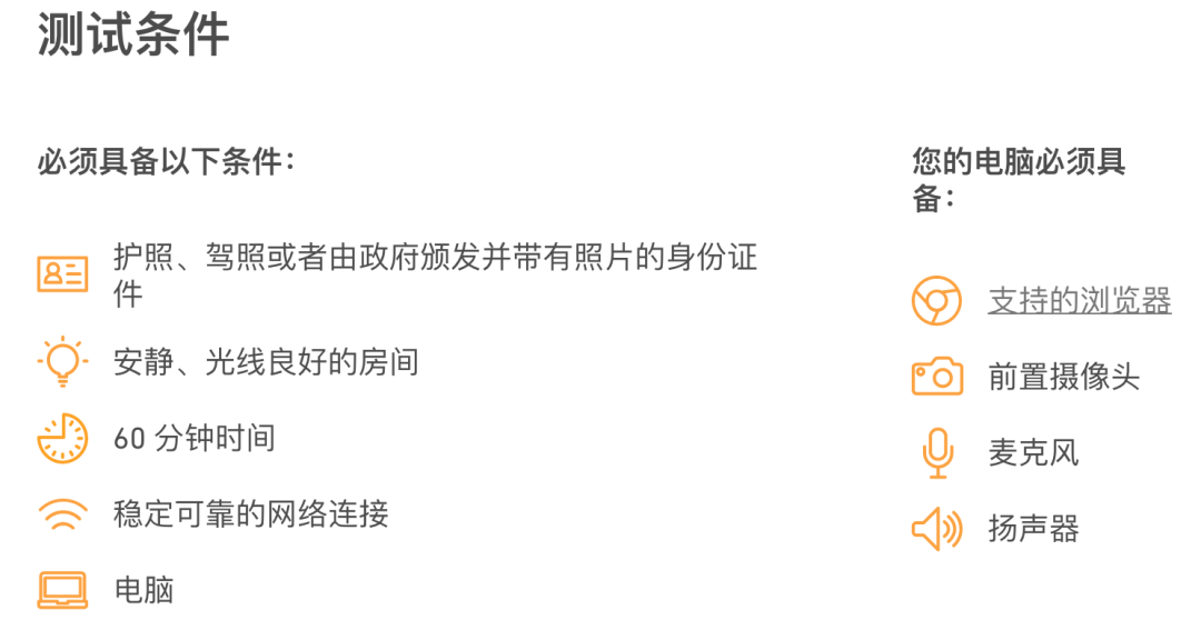 - 形式:任何时间、任何地点、线上完成测试(视频监考)、1小时测试时长