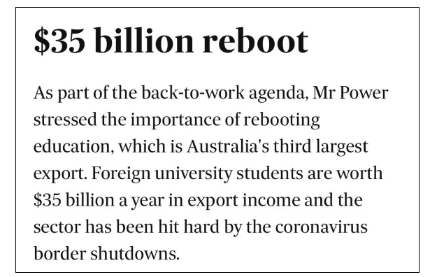 全澳新冠战役协调委员会的商人Nev Power表示,重启教育业对澳洲来说至关重要!教育业也是澳洲第三大出口产业!留学生每年可为澳洲贡献350亿澳元!