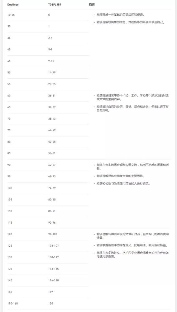 120-160:能够理解各种有难度的文章和对话,包括专门的语言使用情景;能够掌握语言中的潜在含义、比喻用法、实用语和熟语;能够在大多数社交、学术和专业场合流畅自如并充分有效地使用该语言。