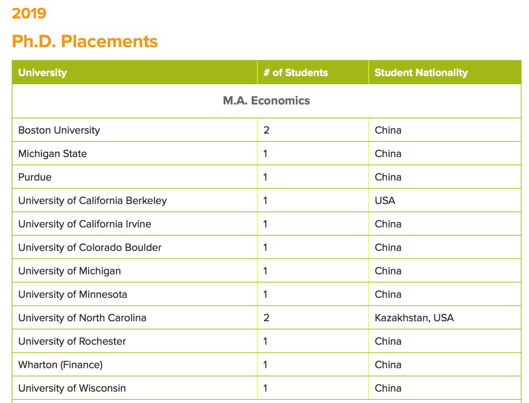 经济学硕士项目(M.A. in Economics)毕业生一般选择继续深造或就业。根据2019年毕业生的就业情况,部分学生在知名高校,如加州大学伯克利分校,波士顿大学,加州大学欧文分校以及沃顿商学院,继续深造。部分同学选择在中国银行,凯尔斯顿贸易公司(Castleton Commoities),中广核(CGN Global)等机构就业。