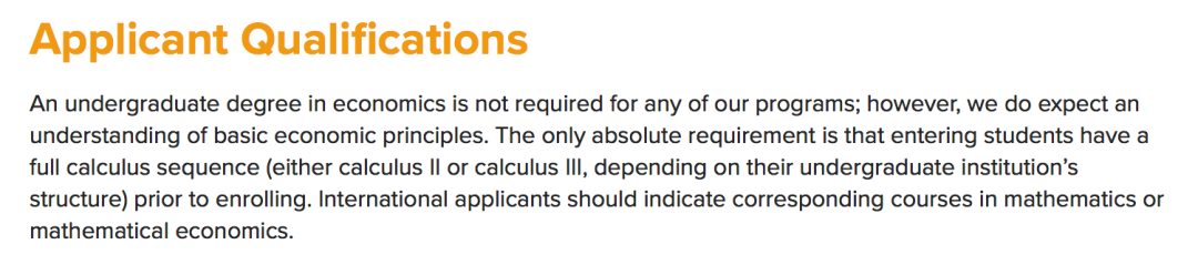 杜克大学的经济学硕士项目(M.A. in Economics)不限制申请人的专业背景,但是期望申请人掌握一定的经济学原理知识。申请者最好修过微积分、线性代数、概率论和统计学相关的课程。