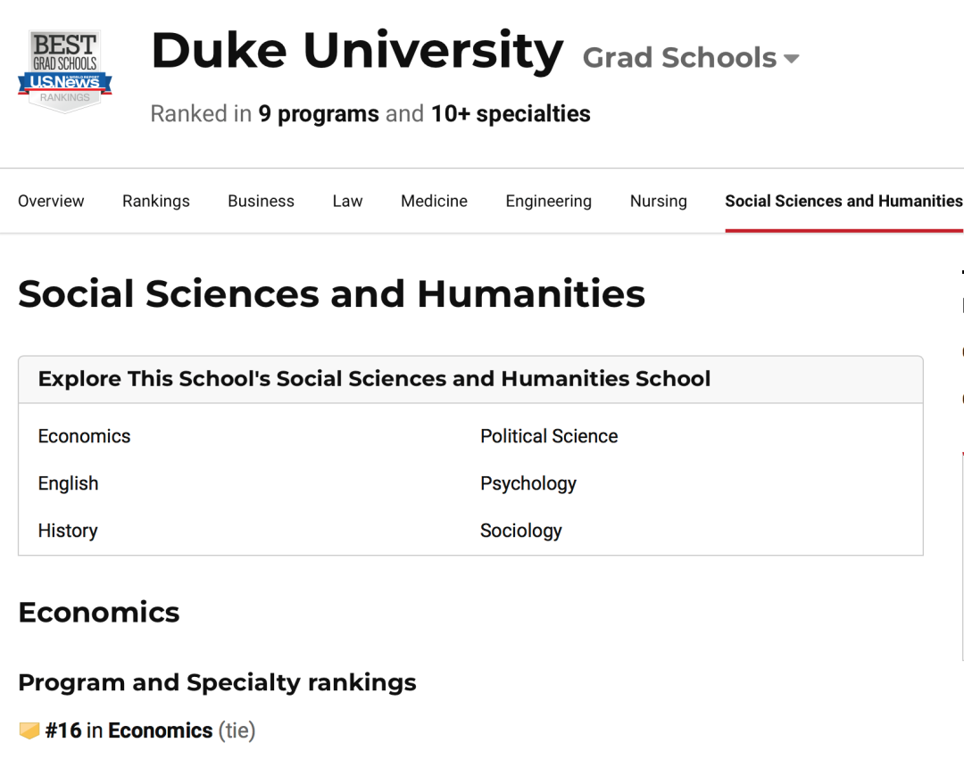 今天为大家介绍一下杜克大学经济学专业硕士,杜克大学是2020 美国新闻与世界报道(U.S. News & Worl Report)综合排名第10的大学。