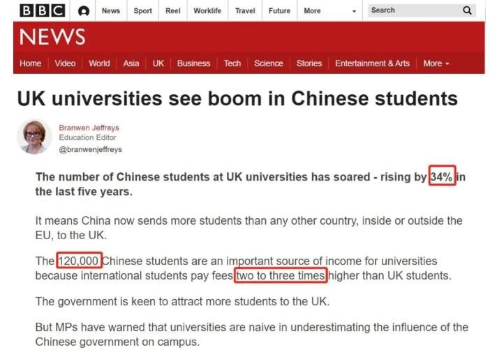 英国因其学制短、教育质量高等优势,英国(尤其是硕士学位)吸引了大批中国留学生。反观英国方面,中国学生向来是英国大学的重要收入来源,毕竟国际学生的学费一般是英国学生的2倍,甚至3倍。