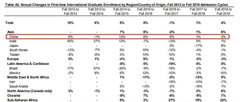 来自撒哈拉以南非洲地区的首次国际学生人数增加5% ,前一年增长27% ;来自拉丁美洲的5%增长加勒比地区,欧洲数量下降3%。来自日本的数量显着下降,下降了15%,沙特阿拉伯则下降了21%。沙特阿拉伯的下降可能部分归因于沙特政府外国奖学金计划的减少。