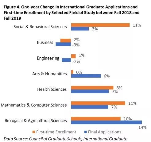 具体来说,物理和地球科学(下降9%)和商业(下降8%)。而从实际注册新生人数看,商科和工程专业留学生人数分别减少3%和2%,人文学科不变外,其他各专业研究生申请人数均有增加。其中,生物与农学留学生人数增长最为明显,较上一年增加14%。