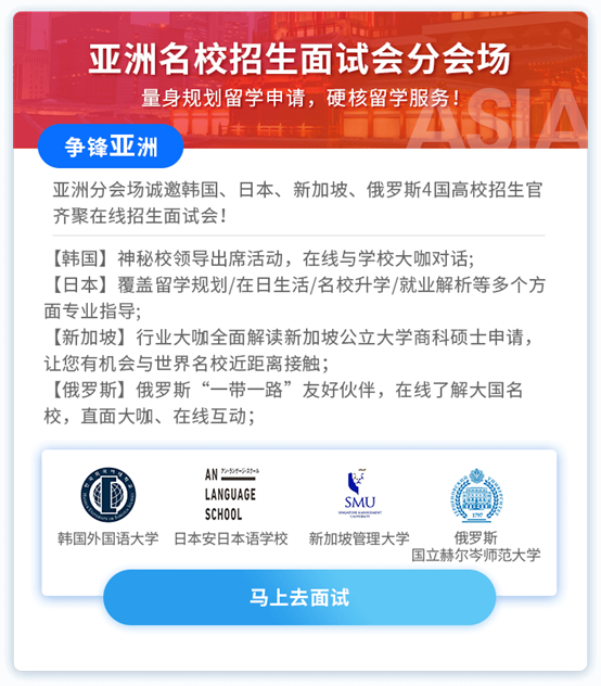 面试会将为学生们呈现与名校 “ 零距离 ” 的交流体验,现场招生、面试评估、全方位解读各自学校招生政策,揭秘留学申请和录取的关键因素 …… 让众多学子不出家门即可近距离约见全球院校招生官。