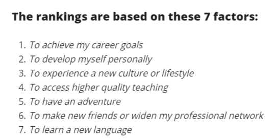 这份排名是根据7项因素对30,000多名国际留学生进行调查,最后综合打分得出。