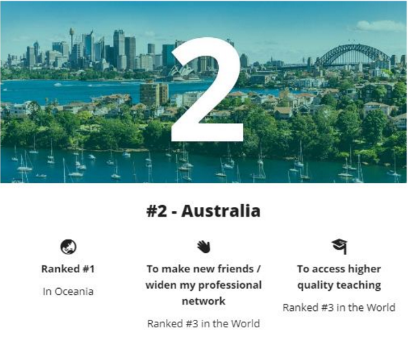 此外澳大利亚在结交新朋友方面的能力也排名第三,在个人发展方面排名第七,这证明了澳大利亚所提供的不仅仅是优质的教育。